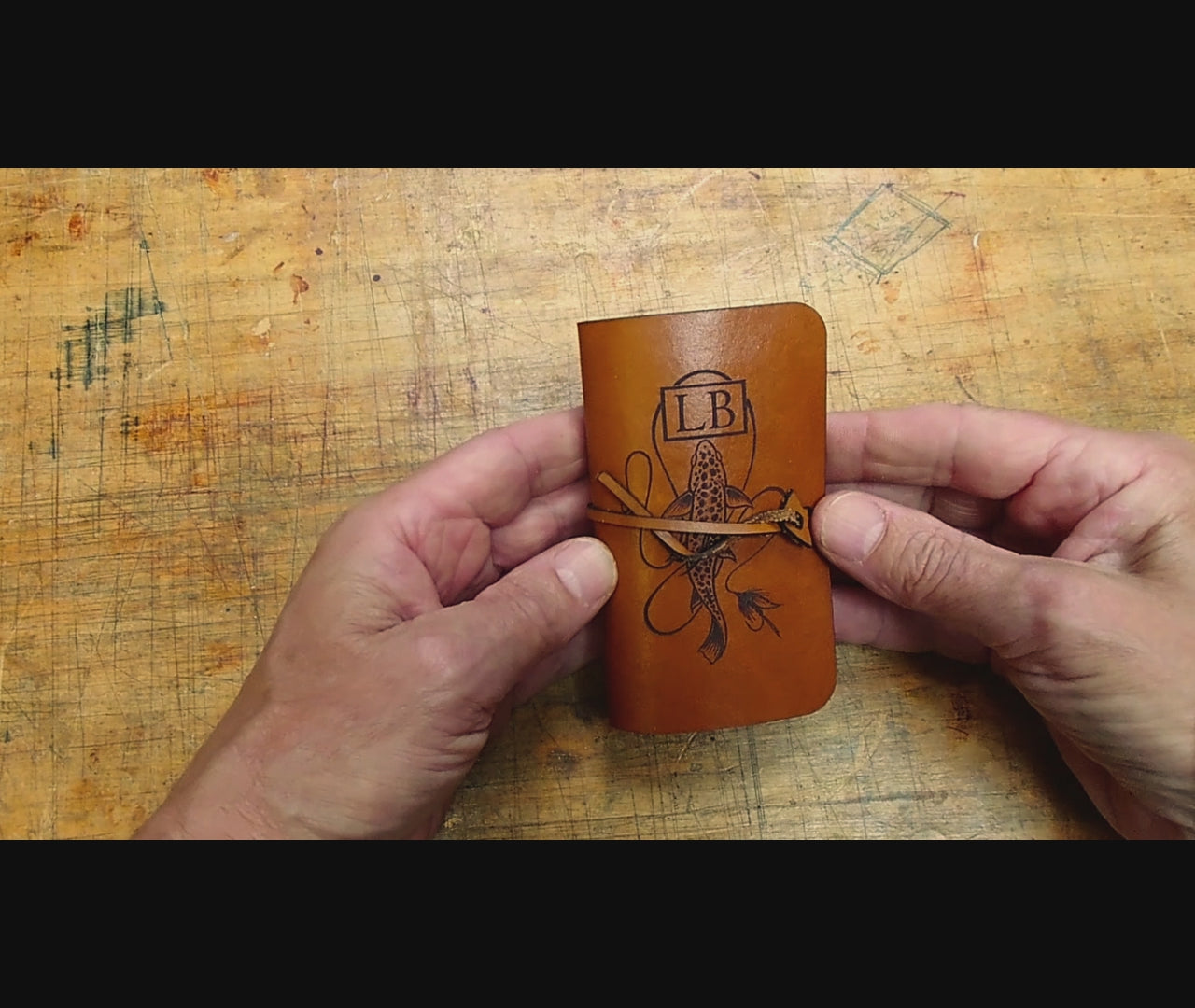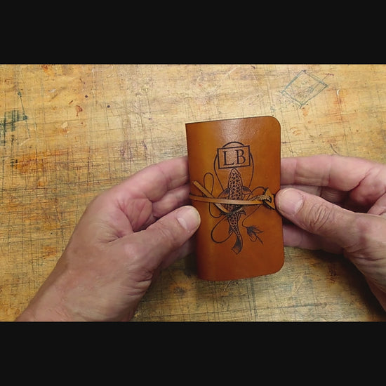 Made from Veg tan leather and lined with a synthetic "wool" and laser etched with the design of a wild brown trout and traditional wet fly.